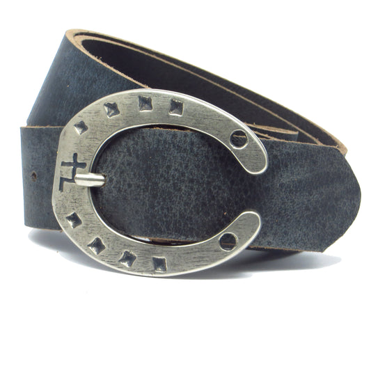 Ledergürtel 4 cm breit blau Büffelleder mit Hufeisenschnalle messing
