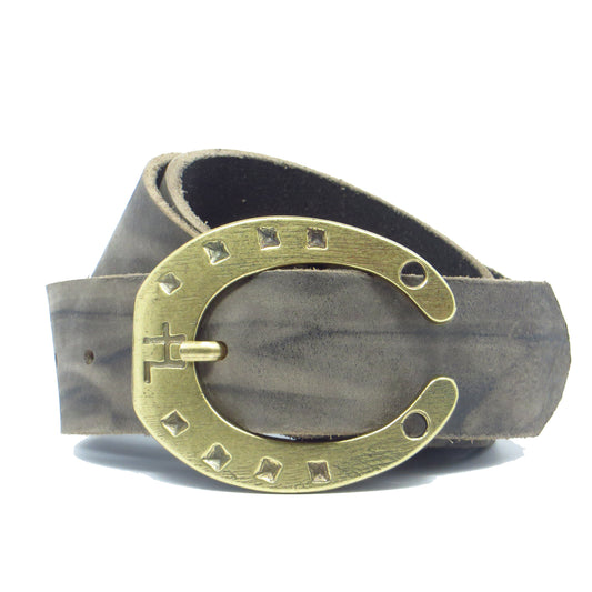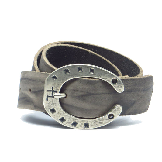 Ledergürtel 4 cm breit grau Büffelleder mit Hufeisenschnalle messing