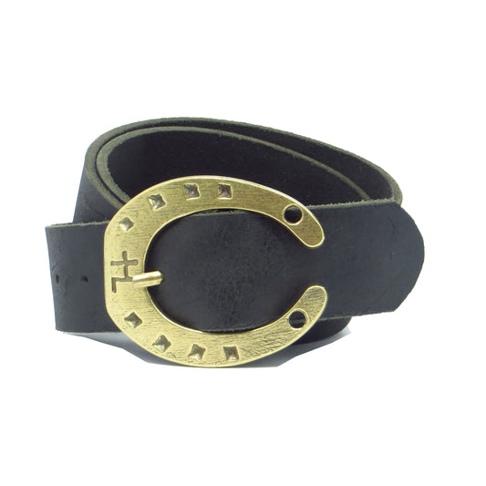 Ledergürtel 4 cm breit schwarz Rindsleder mit Hufeisenschnalle messing