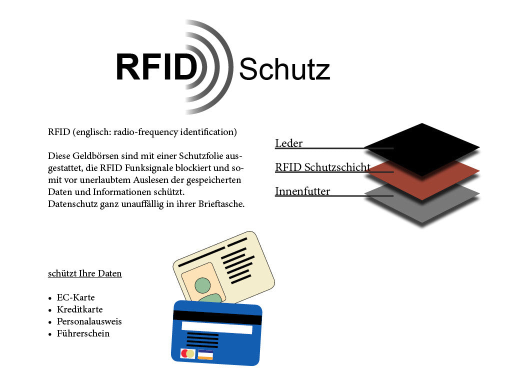 - Unter dem Leder ist eine unsichtbare RFID Schutzfolie eingearbeitet.