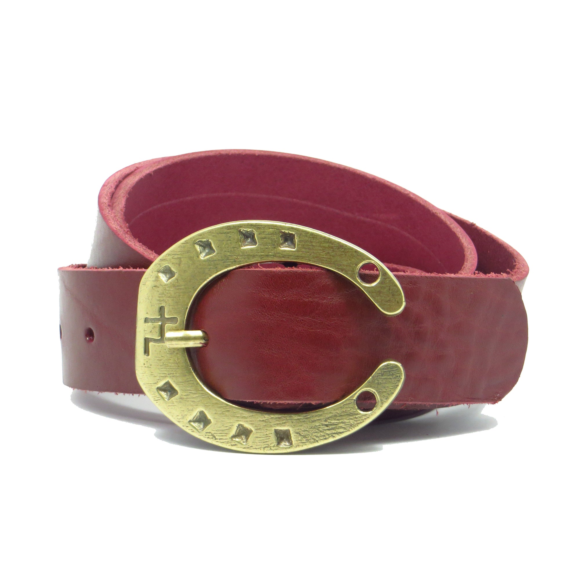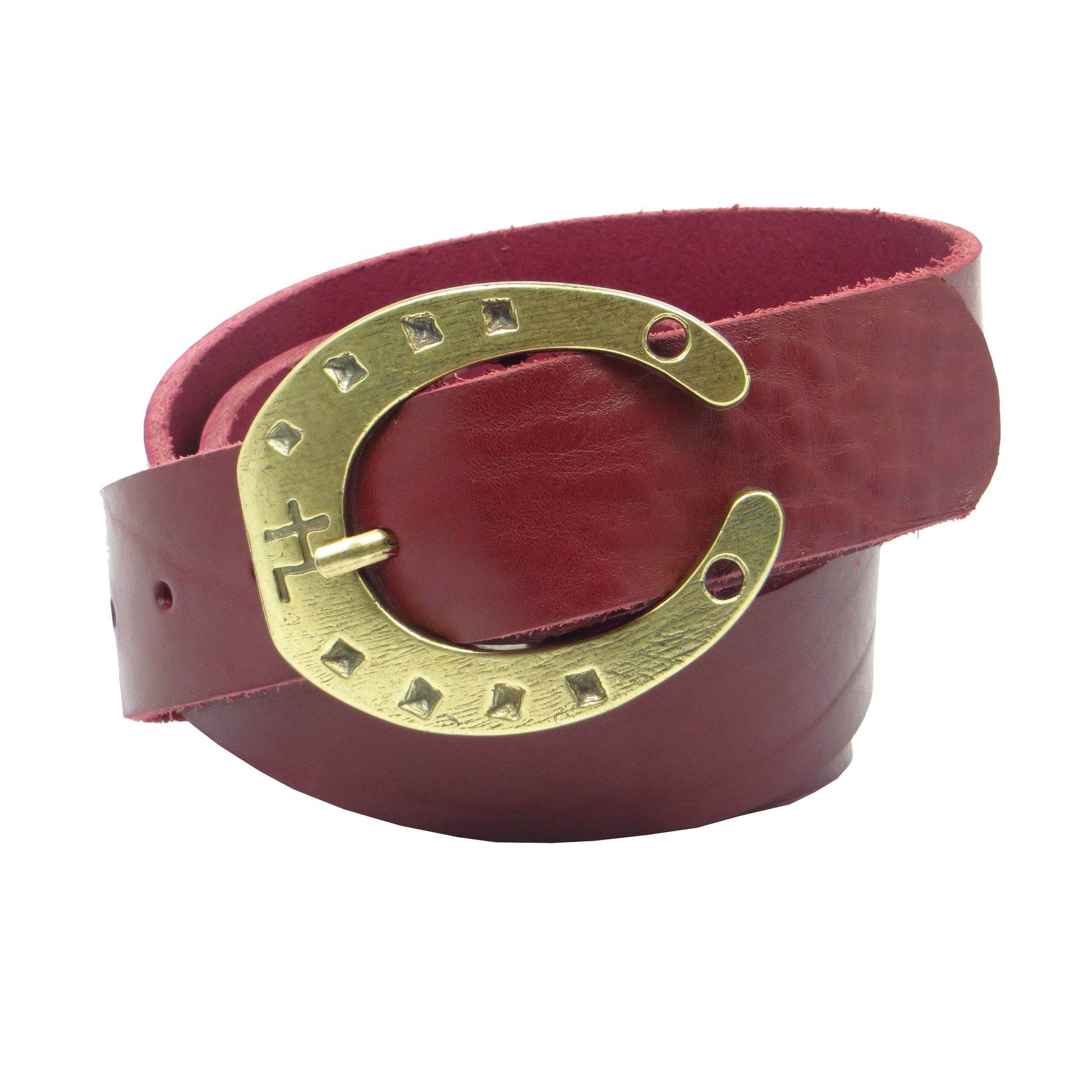 Ledergürtel 4 cm breit bordeaux rot Rindsleder mit Hufeisenschnalle messing