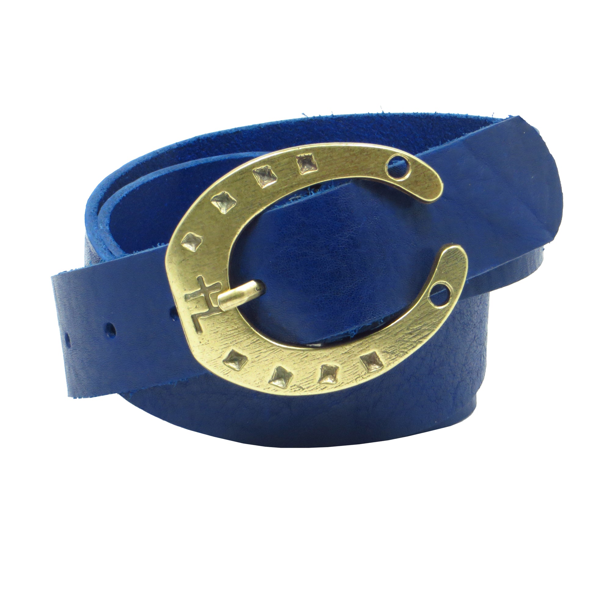 Ledergürtel 4 cm breit blau Rindsleder mit Hufeisenschnalle messing