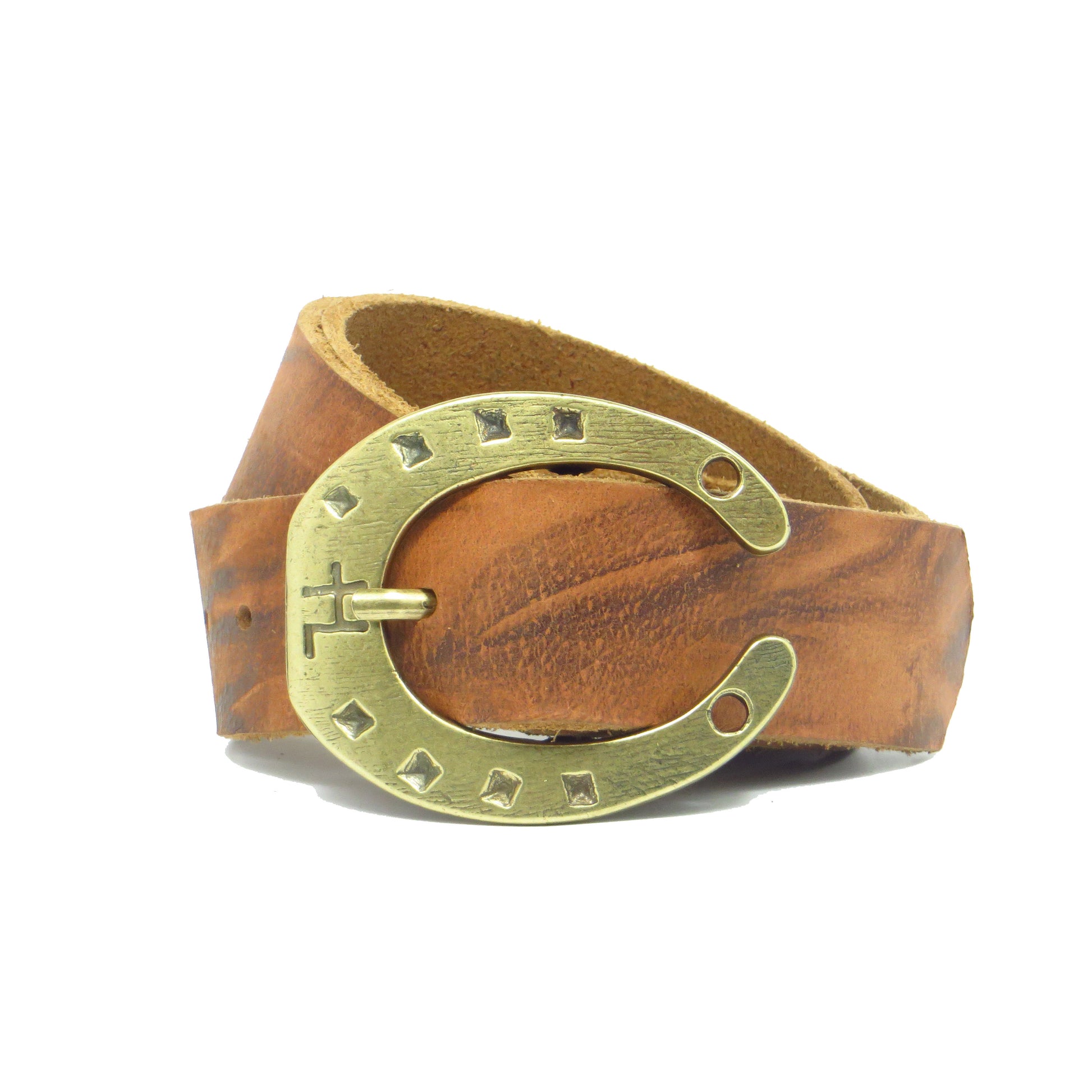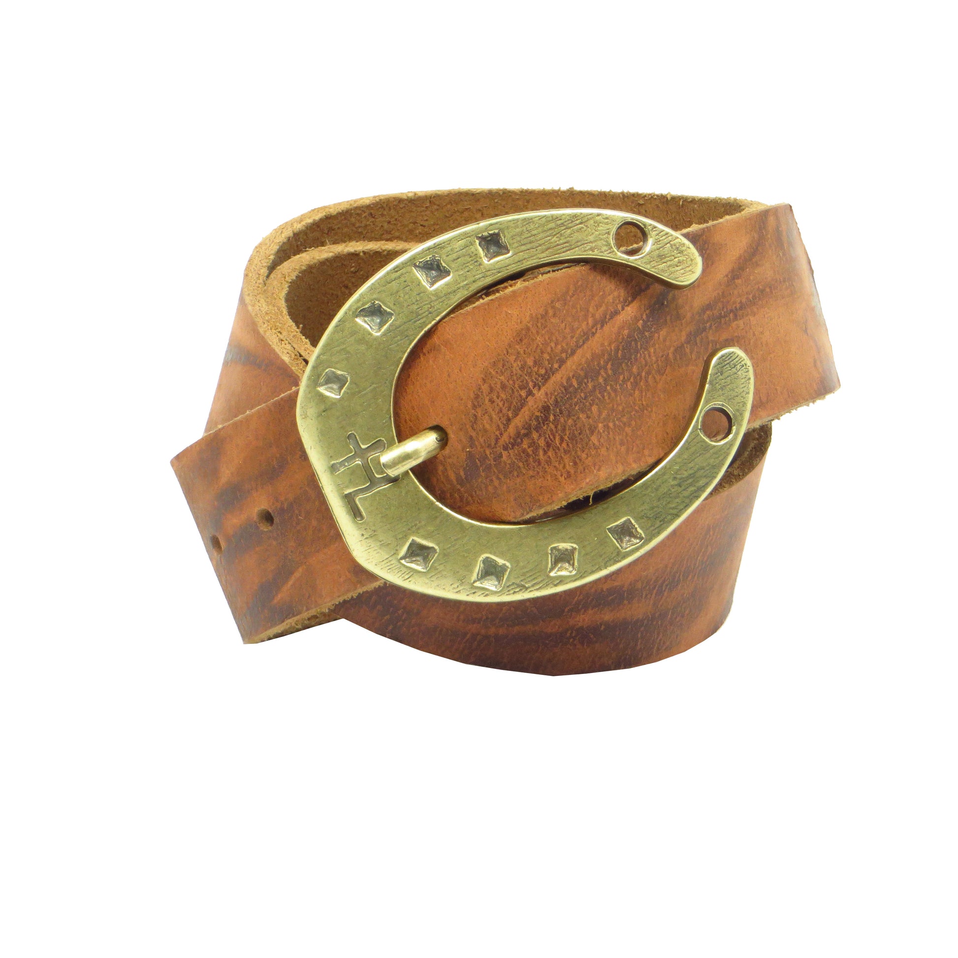 Ledergürtel 4 cm breit braun Büffelleder mit Hufeisenschnalle messing