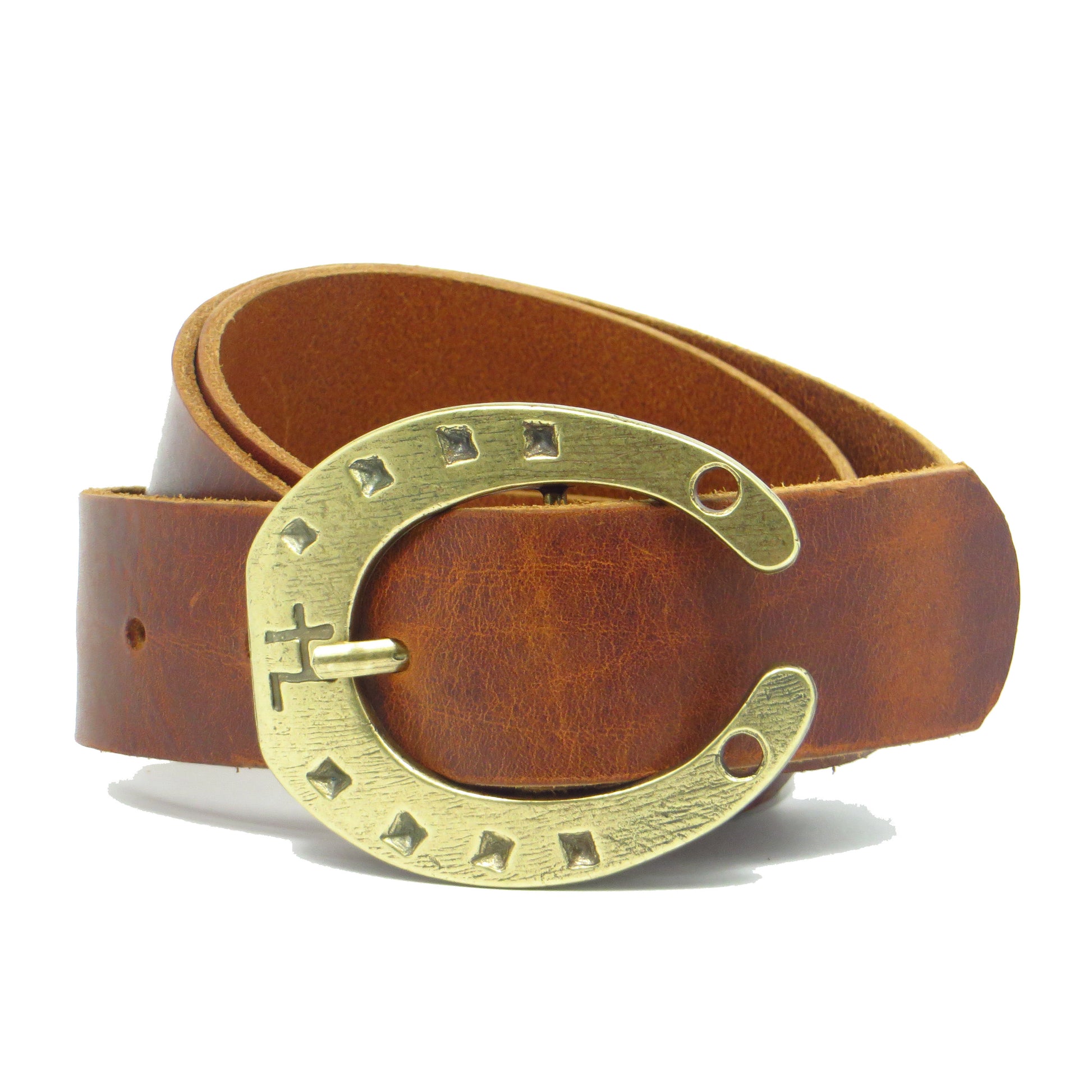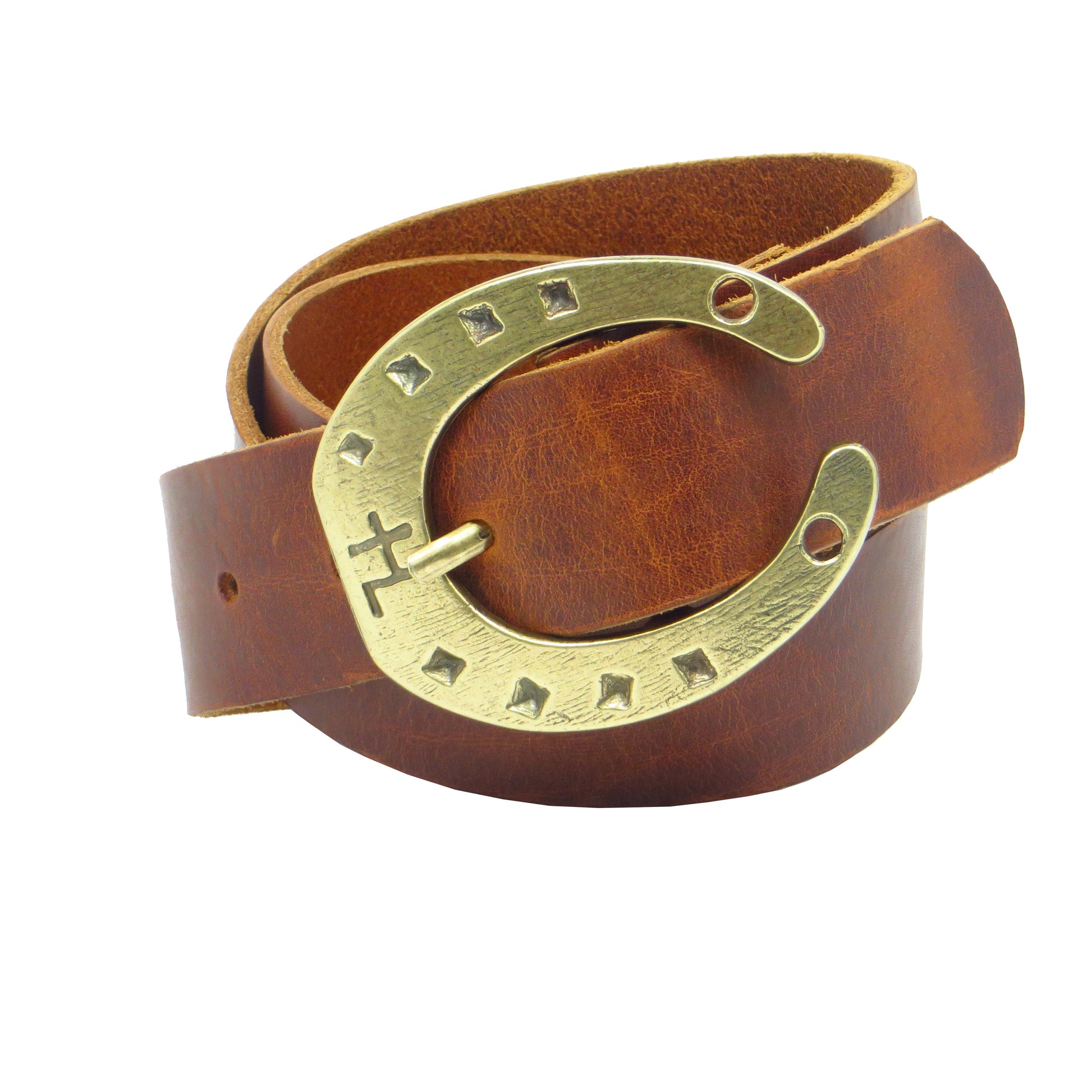 Ledergürtel 4 cm breit cognac braun Rindsleder mit Hufeisenschnalle messing