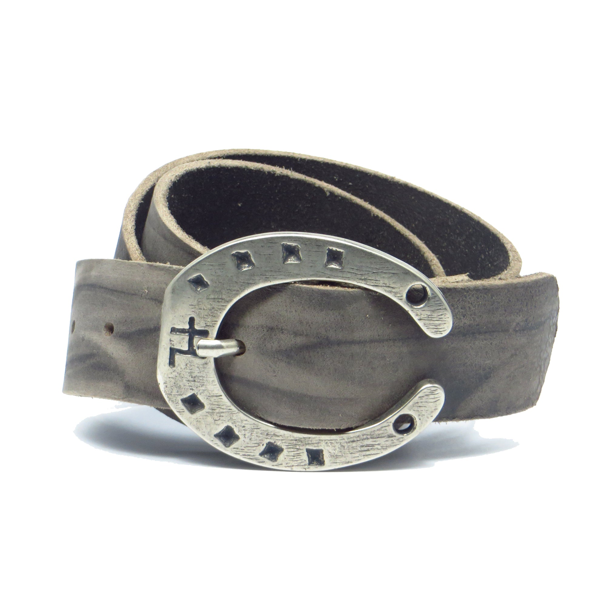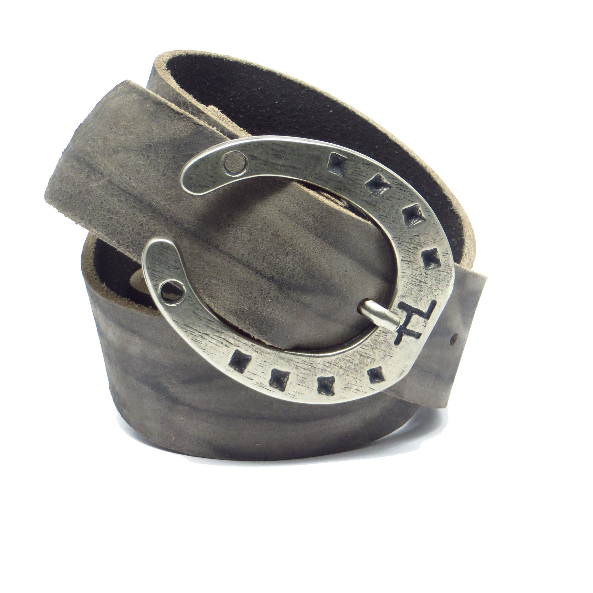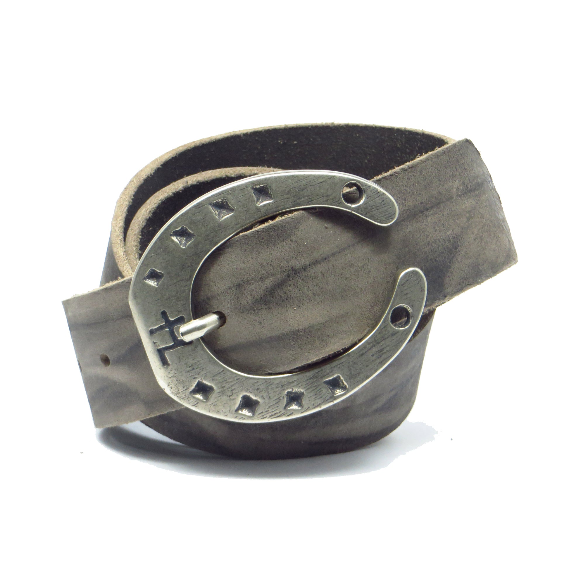 Ledergürtel 4 cm breit grau Büffelleder mit Hufeisenschnalle Silber